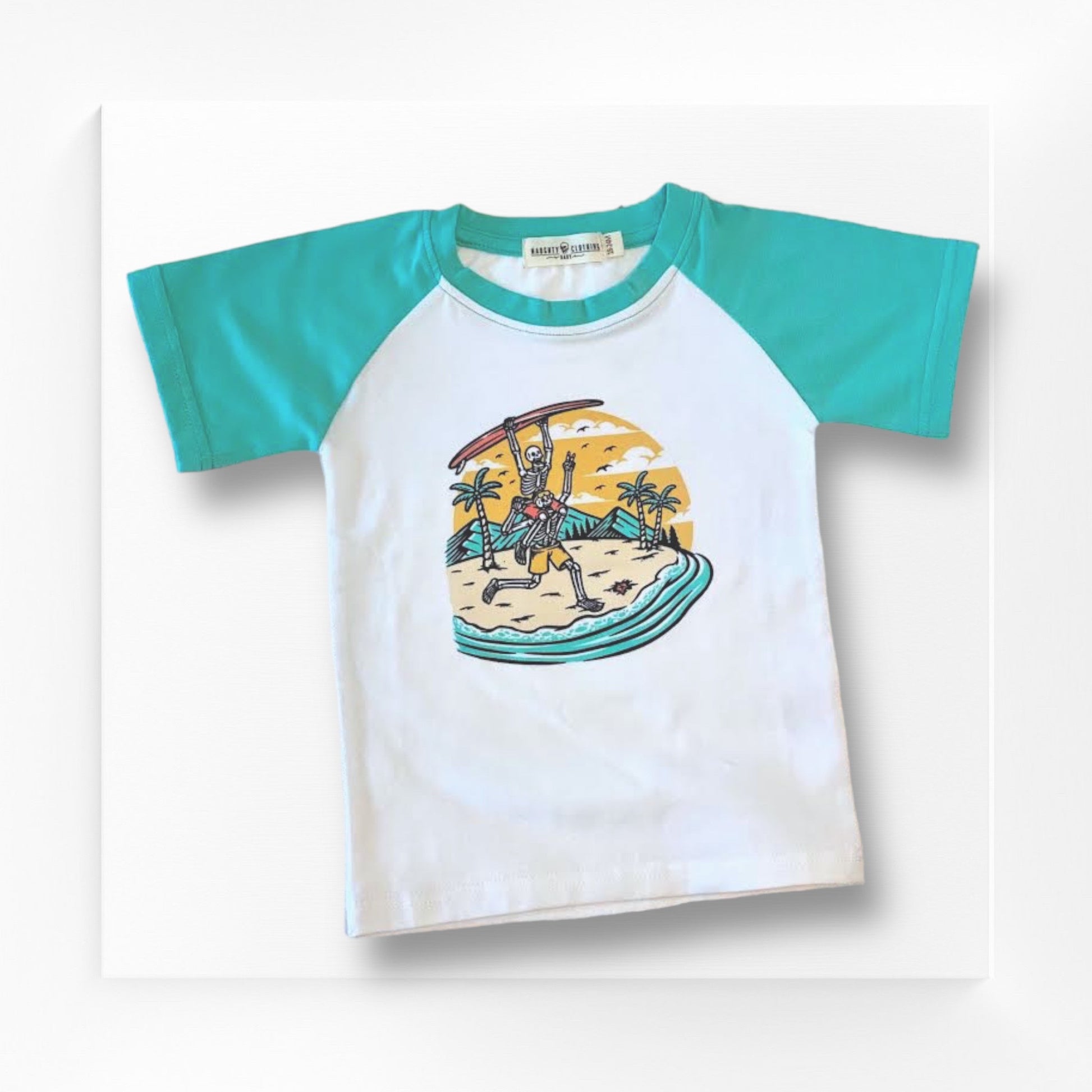 Why was the skeleton surfer afraid to go into the water? Because he didn't have the guts! This short sleeve baby t-shirt is super soft, perfect for daily wear. Your kiddo will be ready to take on the world in this fun Skeleton Shirt.